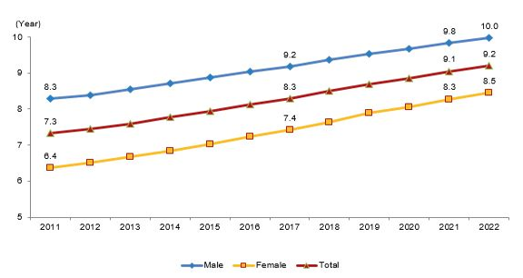 میانگین سنوات تحصیلی برای جمعیت 25 ساله و بالاتر 26 درصد از 7.3 سال در سال 2011 به 9.2 سال در سال 2022 افزایش یافته است. در سال 2022، میانگین سنوات تحصیلی برای زنان 8.5 سال و برای مردان 10.0 سال بود.