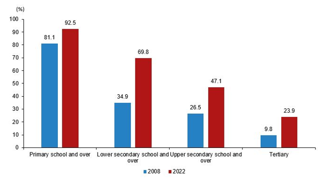 در حالی که میزان مدرک کاردانی، کارشناسی، کارشناسی ارشد و دکتری 25 سال و بالاتر در کل جمعیت 25 سال و بالاتر در سال 2008 به میزان 9.8 درصد بوده است، این میزان در سال 2022 به 23.9 درصد افزایش یافته است. در حالی که میزان فارغ التحصیلان دوره ابتدایی و بالاتر در گروه سنی مذکور در سال 2008 به میزان 81.1 درصد بوده است، این میزان در سال 2022 معادل 92.5 درصد محاسبه شده است.