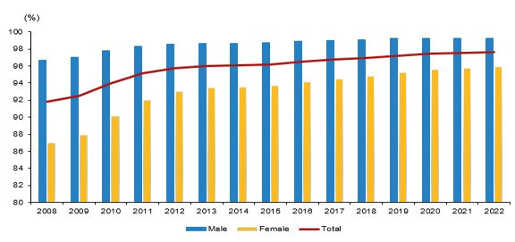 در حالی که میزان باسوادان 6 سال و بالاتر در سال 2008 به میزان 91.8 درصد بود، این میزان در سال 2022 به میزان 97.6 درصد محاسبه شد، و برای مردان این میزان از 96.7 درصد به 99.3 درصد افزایش یافته است.