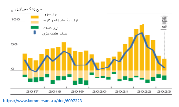 بر اساس گزارش بانک روسیه، مازاد حساب جاری تراز پرداخت ها در نیمه اول سال 2023 به 20.2 میلیارد دلار کاهش یافته است که 7.3 برابر کمتر از مدت مشابه سال 2022 است. این مازاد از 14.8 میلیارد دلار در سه ماهه اول به 5.4 میلیارد دلار در سه ماهه دوم کاهش یافت و در ژوئن 2023 حتی برای اولین بار از آگوست 2022 به کسری 1.4 میلیارد دلاری رسید. "ترازهای اخیر متاثر از عامل فصلی - اعلام سود سهام توسط شرکت های روسی است. بانک مرکزی توضیح میدهد که این وضعیت قبلاً نیز در دورههای مشابه سالهای گذشته با فضای نامطلوب برای صادرات روسیه مشاهده شده است. با این حال، به گفته تحلیلگران کانال تلگرام Solid Numbers، با در نظر گرفتن فصلی بودن، تراز همچنان مثبت است - حدود 1.8 میلیارد دلار. دلیل اصلی کسری حساب جاری کاهش صادرات و افزایش واردات از جمله خدمات گردشگری است (در ژانویه تا ژوئن 2023 تراز تجارت خارجی در شرایط سالانه 3.3 برابر کاهش یافت و به 54.3 میلیارد دلار رسید). دلیل دیگر افزایش تراز منفی درآمدهای اولیه و ثانویه است که شامل پرداخت سود و سود سهام میشود.