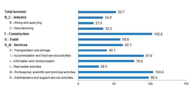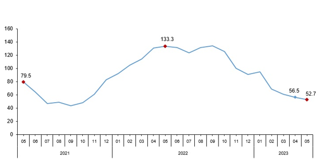 شاخص کل گردش مالی ترکیه (100=2015) شامل صنعت، ساخت و ساز، تجارت و خدمات در ماه می 2023 به میزان سالانه 52.7 درصد افزایش یافت.