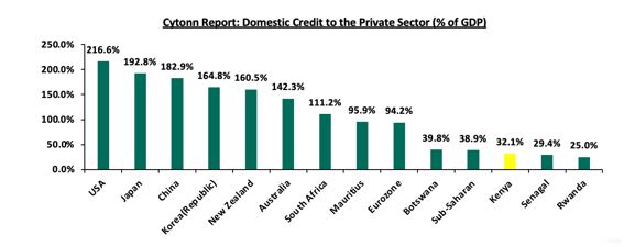 طبق گزارش بانک جهانی، اعتبار داخلی کنیا به بخش خصوصی به عنوان درصدی از تولید ناخالص داخلی در سال 2020، 32.1 درصد بود. این در مقایسه با میانگین 38.4 درصد برای منطقه جنوب صحرای آفریقا، 111.2 درصد برای آفریقای جنوبی و 164.2 درصد برای اقتصادهای پیشرفته، رقم پایینی به نظر میرسد. به این ترتیب، هنوز شکاف 67.9 درصدی در اعتبار برای دستیابی به 100.0 درصد اعتبار بخش خصوصی نسبت به تولید ناخالص داخلی وجود دارد. کنیا به جهت تامین اعتبار لازم برای بخش خصوصی به 12100 میلیارد شیلینگ نیاز دارد که تا دسامبر 2022 2022، 3400 میلیارد شیلینگ تهیه کرده است، بنابراین کسری 8700 میلیارد شیلینگ است. برای تحقق این امر، کنیا باید بازار سرمایه خود را احیا کرده و اعتبار بیشتری به بخش خصوصی خود اختصاص دهد. نمودار زیر اعتبارات داخلی اعطایی به بخش خصوصی را در طول سالیان نشان می دهد. (منبع: بانک مرکزی کنیا)