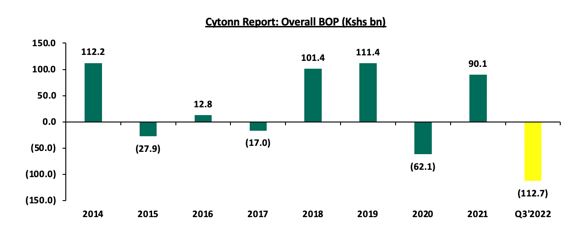 اداره ملی آمار کنیا طی گزارشی تراز پرداخت(BOP) سه ماهه سوم سال 2022 را منتشر کرد که نشان میدهدBOP با کاهش 283.9 درصدی به کسری 112.7 میلیارد شیلینگ در قیاس با کسری 29.3 میلیارد شیلینگ که در سه ماهه سوم سال 2021 ثبت شده بود، رسیده است. بدتر شدن عملکرد تراز پرداخت عمدتاً به دلیل افزایش 5.5 درصدی کسری حساب جاری به 193.4 میلیارد شیلینگ در سه ماهه سوم 2022 در قیاس با 183.4 میلیارد شیلینگ در مدت مشابه در سال 2021 بود و نشان دهنده آن است که کشور به واردات بیشتر از صادرات متکی است. نمودار زیر BOP را در 9 سال گذشته نشان میدهد.