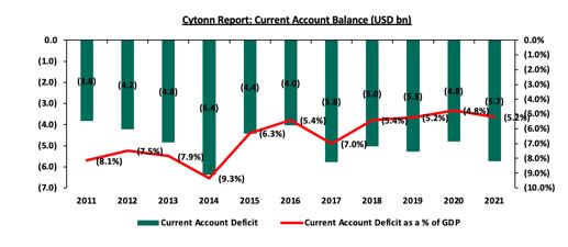 افزایش کسری حساب جاری عمدتاً ناشی از افزایش قیمت جهانی سوخت است که در نتیجه هزینه واردات سوخت را افزایش میدهد از آنجا که کنیا واردکننده نفت است. این افزایش همچنین به کاهش ارزش پول نسبت داده میشود. به این ترتیب، این امر منجر به کاهش قابل توجه ذخایر ارزی میشود. علاوه بر این، صادرات کنیا نیز در طول سالها بدتر شده است که عمدتاً ناشی از تولید پایین کشاورزی به دلیل الگوهای آب و هوایی نامنظم و خشکسالی طولانیمدت است. نمودار زیر روند تراز حساب جاری را در 10 سال گذشته نشان می دهد. (منبع: اداره آمار کنیا)