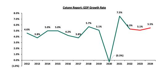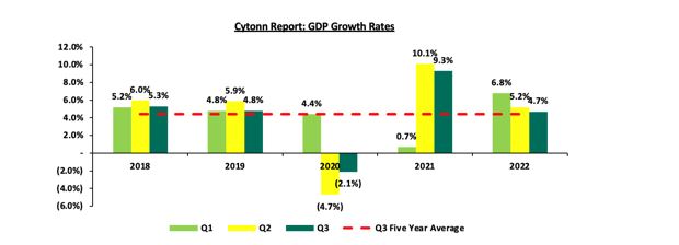 بر اساس گزارش تولید ناخالص داخلی سه ماهه سوم سال 2022 اداره ملی آمار کنیا (KNBS)، اقتصاد کنیا در سه ماهه سوم سال 2022 به میزان 4.7 درصد رشد داشته است که به طور قابل توجهی کمتر از رشد 9.3 درصدی ثبت شده در دوره مشابه در سال 2021 است، شایان ذکر است که در سه ماهه سوم سال 2020، اقتصاد درگیر همهگیری کووید-19 بود. بخش کشاورزی و جنگلداری با نرخ 14.8 درصد بیشترین سهم را در تولید ناخالص داخلی داشته و پس از آن املاک و مستغلات با 10.5 درصد قرار دارد. با این حال، سهم بخش کشاورزی در تولید ناخالص داخلی از 16.3 درصد در سه ماهه سوم 2021 به 14.8 درصد کاهش یافته است. میانگین تولید ناخالص داخلی برای سه ماهه اول ۲۰۲۲، سه ماهه دوم ۲۰۲۲ و سه ماهه سوم ۲۰۲۲ در مقایسه با میانگین ۶.۹ درصدی در سال ۲۰۲۱ در مدت مشابه، به ۵.۶ درصد رسید. نمودار زیر نرخ رشد سه ماهه در پنج سال گذشته را نشان میدهد.