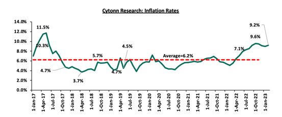 تا فوریه 2023، تورم به 9.2 درصد رسید که نسبت به 9.0 درصد ثبت شده در ژانویه 2023، بالاتر رفته و از محدوده هدف بانک مرکزی 7.5٪ -2.5٪ تجاوز کرده است. تورم اصلی ناشی از قیمت بالای مواد غذایی و سوخت بوده است. قیمت بالای مواد غذایی عمدتاً در نتیجه شرایط آب و هوایی نامنظم است که منجر به خشکسالی طولانی مدت در کشور شده و هزینه بالای نهادههای کشاورزی باعث افزایش هزینه تولید شده است. از سوی دیگر، افزایش قیمت سوخت به دلیل محدودیت های زنجیره تامین جهانی و حذف نسبی یارانه سوخت تشدید شده است. قیمت سوخت در ژوئیه 2023 به 195 شیلینگ برای هر لیتر بنزین سوپر رسیده است در حالی که تا پایان 2022 قیمت هر لیتر بنزین سوپر، دیزل و نفت سفید به ترتیب 177.3شیلینگ و 162.0 شیلینگ و 145.9 شیلینگ بوده است لازم به ذکر است که قیمت سوخت در دسامبر 2021 به ترتیب برای بنزین سوپر، دیزل و نفت سفید، 129.7 شیلینگ، 110.6 شیلینگ و 103.5 شیلینگ در هر لیتر بوده است. نمودار زیر تورم ماهانه از سال 2017 را نشان می دهد.