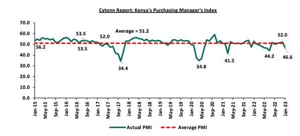 شاخص خرید مدیران در فوریه 2023 (PMI) برای اولین بار در شش ماه گذشته از بالاترین رقم 11 ماهه 52.0 در ژانویه 2023 به عدد 46.6 کاهش یافت. هزینههای مصرف کننده، کاهش ارزش پول و محدودیت های زنجیره تامین نشان می دهد. در سال 2022، این شاخص به طور متوسط 49.2 بود که حاکی از فضای کسب و کار بد به دلیل شرایط سخت اقتصادی و آشفتگی¬های قبل از انتخابات بود. با این حال، این شاخص در دوره بین سپتامبر و دسامبر 2022 به طور میانگین به عدد 51.1 رسید. نمودار زیر روند PMI را در هشت سال گذشته نشان میدهد.