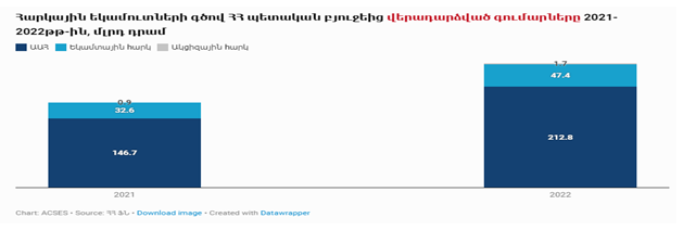 (مبالغ برگشتی از بودجه دولتی جمهوری ارمنستان بابت درآمدهای مالیاتی در سال 2021-2022 به میلیارد درام، آبی تیره: مالیات بر ارزش افزوده، آبی روشن: مالیات بر درآمد، طوسی: مالیات غیرمستقیم)