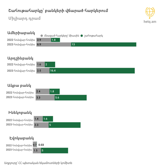 پس از جنگ روسیه و اوکراین در سال 2022، روسهایی که به ارمنستان نقل مکان کردند، به نیروی محرکه رکورد سود بانکهای ارمنستان تبدیل شدند.اکثر بانکها در سه ماهه دوم سال جاری مالیات بر سود دریافتی در سال مذکور را پرداخت کردهاند که دلیل جهش مالیات آنها بوده است. در مقایسه با نیمه اول سال 2022، حجم مالیات پرداختی بانکهای مالیاتدهنده بزرگ حدود 60 میلیارد درام افزایش یافته یا معادل 2.8 برابر شده است.