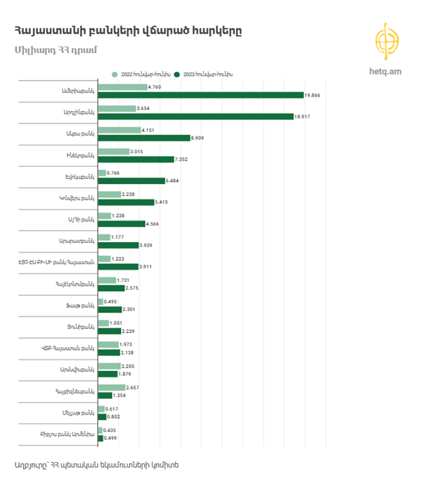(مالیات پرداختی بانکهای ارمنستان در شش ماهه اول سالهای 2022 و 2023، نام بانکها از بالا به پایین: آمریا بانک، آردشین بانک، آکبا بانک، ایناکو بانک، اِوُکا بانک، کُنوِرس بانک، آیدی بانک، آرارات بانک، اچاسبیسی بانک، های اِکُنوم بانک، فَست بانک، یونی بانک، وتب بانک، آرم سوئیس بانک، های بیزنس بانک، ملت بانک، بیبلوس بانک)