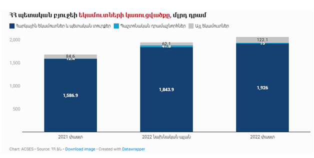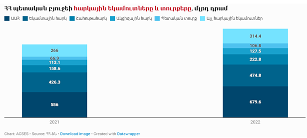 در سال 2022، درآمدهای بودجه دولتی بالغ بر 2.06 تریلیون درام بوده که 22.5 درصد بیشتر از سال 2021 و 5.9 درصد بیشتر از برنامه اولیه دولت است. افزایش درآمدهای بودجه عمدتاً به دلیل افزایش درآمدهای مالیاتی بوده که به طور قابل توجهی تحت تأثیر فعال شدن اقتصاد ارمنستان در نتیجه درگیری روسیه و اوکراین بوده است.