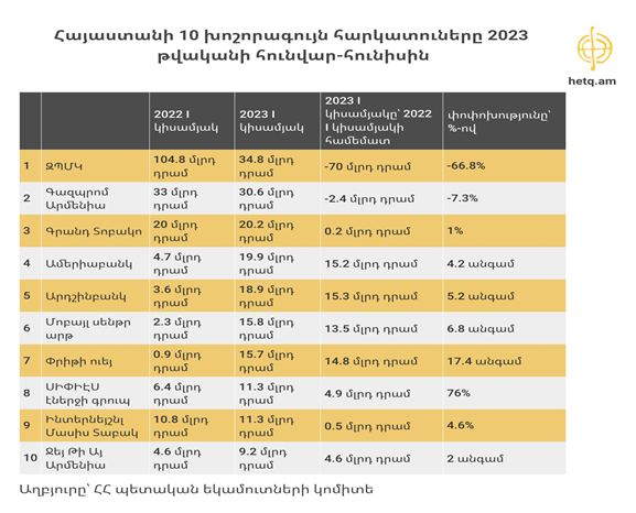 (جدول 10 مالیات پرداختکننده بزرگ در نیم سال اول سال 2023 _ از چپ به راست: نیم سال 2022، نیم سال 2023، مقایسه نیم سال اول 2023 با 2022، تغییرات به درصد. از بالا به پایین: کارخانه مس و مولیبدن زنگهزور، گازپروم آرمنیا، گرند توباکو، آمریابانک، آردشین بانک، موبایل سنتر آرت، پریتی وِی، سیپیاِس انرژی گروپ، اینترنشنال ماسیس تاباک، جِیتیآی آرمنیا)