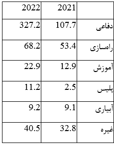در بخش هزینههای سرمایهای حوزه دفاعی نسبت به سال 2021 رشد ویژهای داشته است، 129.6 میلیارد درام یا 2.2 برابر، راهسازی 14.8 میلیارد درام یا 28 درصد، حوزه آموزش حدود 10 میلیارد درام یا 77 درصد، پلیس در سال 2022 حدود 4.4 برابر یا 8.6 میلیارد درام افزایش یافته است.