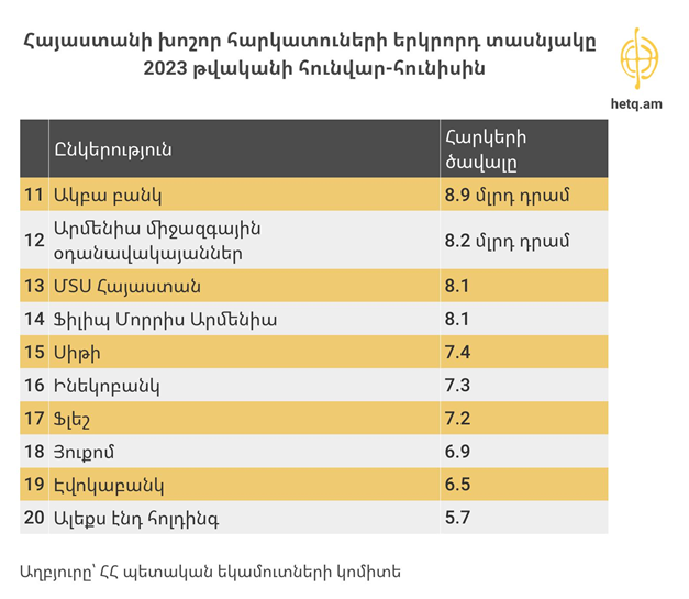 در نیمه اول سال 2023 در میان ردههای دهم تا بیستم بزرگترین مالیات پرداختکنندگان، آکبا بانک، این اِکوُ بانک، اِوُکا بانک، اپراتورهای مخابراتی اِمتیاِس آرمنیا و یوکام، فیلیپ موریس آرمنیا در زمینه واردات و فروش سیگار، فروشگاه زنجیرهای سیتی و هلدینگ آلکس، شرکت فِلَش فعال در واردات و فروش سوخت و فرودگاه بینالمللی زوارتنوتس ارمنستان قرار دارند.