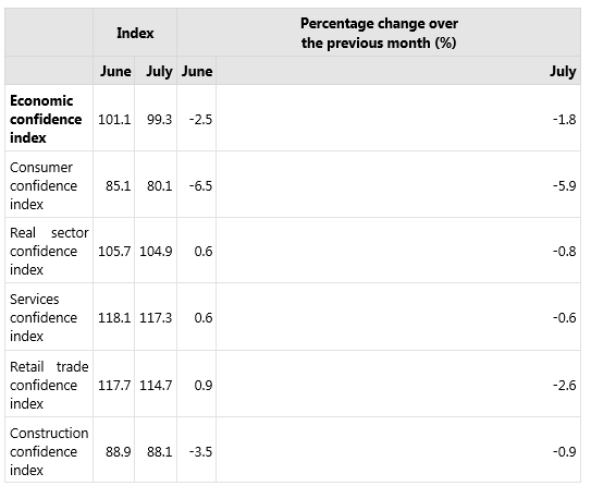 شاخص اطمینان مصرف کننده با 5.9 درصد کاهش به 80.1 رسید، شاخص اطمینان بخش واقعی (صنعت تولیدی) با 0.8 درصد کاهش به 104.9 رسید، شاخص اعتماد بخش خدمات با 0.6 درصد کاهش به 117.3رسید، شاخص اعتماد خرده فروشی با 2.6 درصد کاهش 114،7 شد. شاخص اعتماد بخش ساخت و ساز در ماه ژوییه نسبت به ماه قبل با 0.9 درصد کاهش به 88.1 رسید.