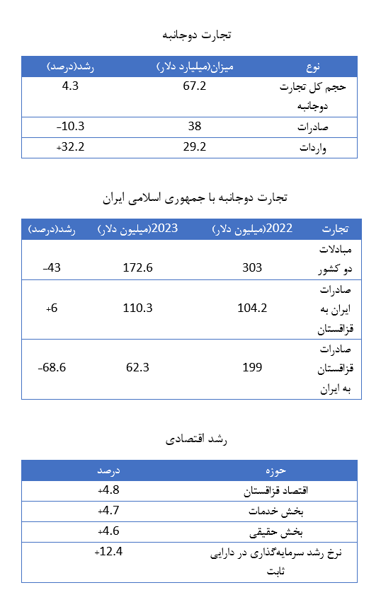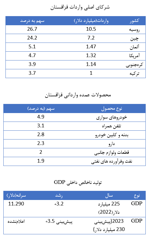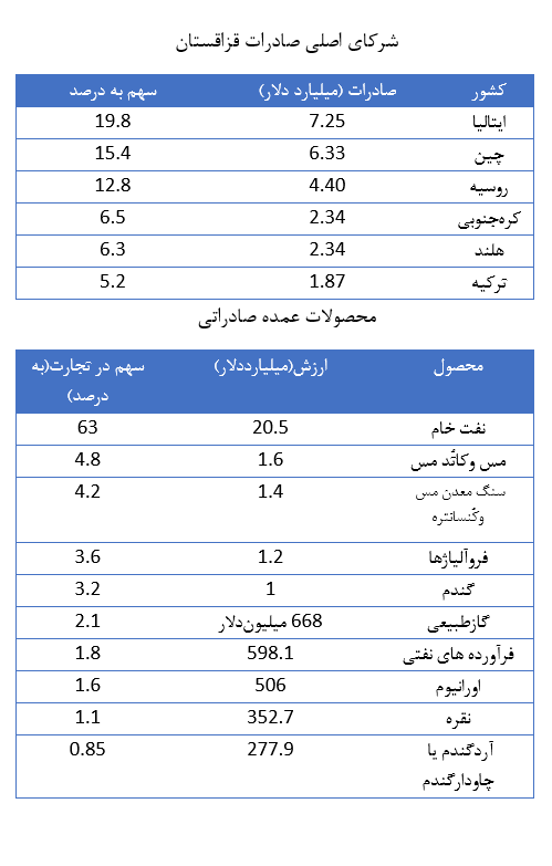 همچنین میزان صادرات این کشور با کاهش 10.3-% برابر با 38 میلیارد دلار و واردات با رشد 32.2% معادل 29.2 میلیارد دلار بوده است. بر اساس آمار منتشر شده، روسیه همچنان مهمترین شریک وارداتی قزاقستان با 10.5 میلیارد دلار سهم 26.7% را به خود اختصاص داده است. مهمترین شریک صادراتی این کشور نیز ایتالیا با 7.25 میلیارد دلار سهم 19.8% را به خود اختصاص داده است. رشد تولید ناخالص داخلی قزاقستانGDP،بر اساس پیشبینی بانک جهانی در پایان 2023 میلادی برابر با 3.5+ خواهد بود. همچنین میزان صادرات جمهوری اسلامی ایران در 6 ماهه نخست 2023 برابر با 110.3 میلیون دلار بوده که در قیاس با مدت مشابه در سال گذشته، رشد 6 درصدی داشته است.