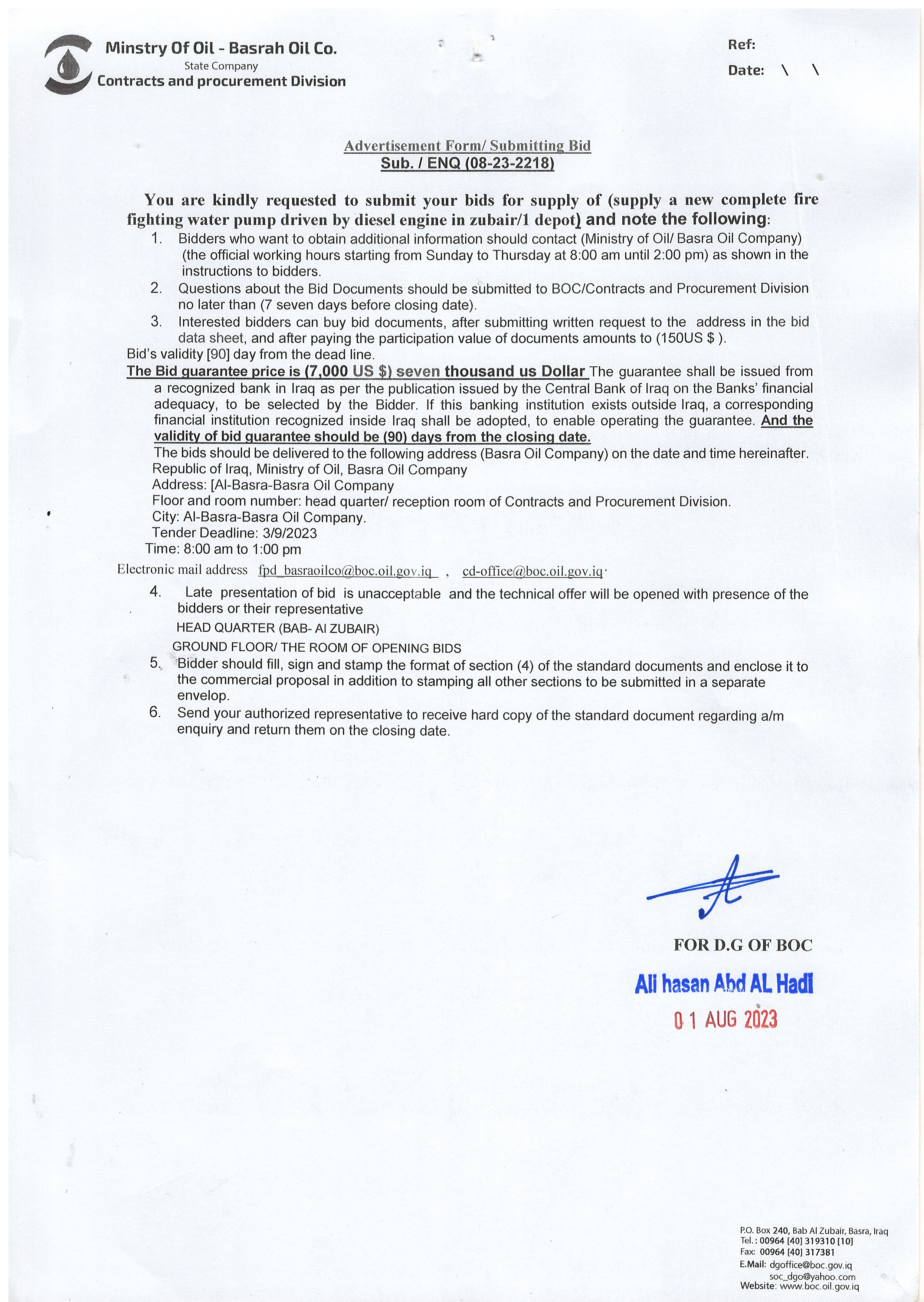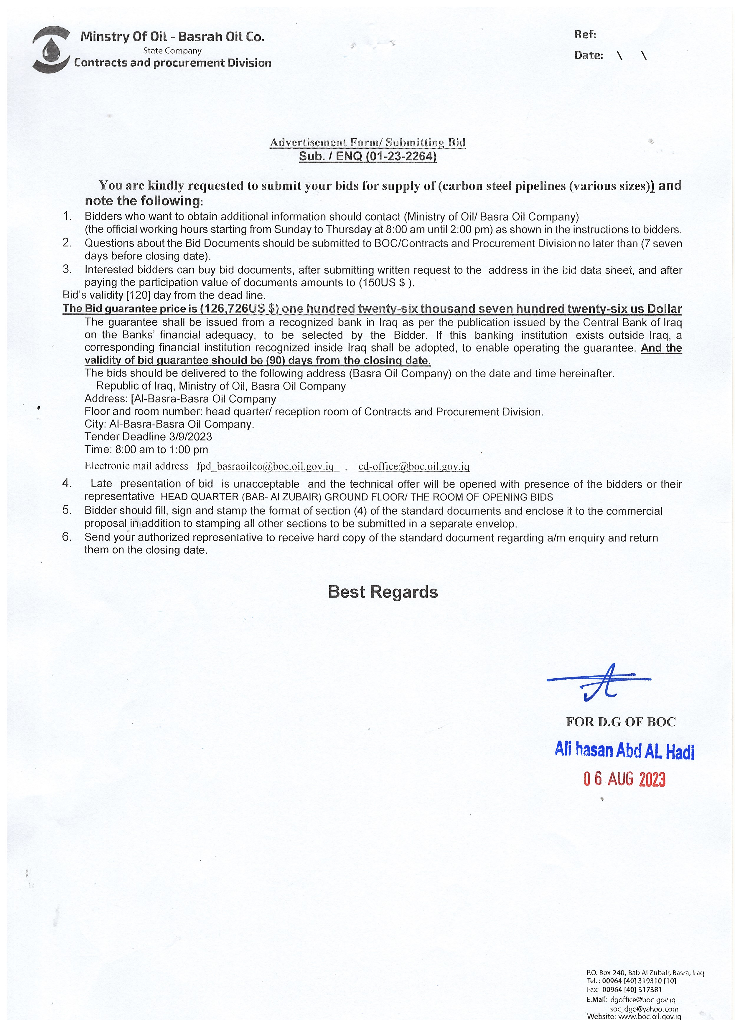 شرکت نفت بصره در نظر دارد 4 فقره مناقصه با موضوعات خرید خط لوله کربن استیل، پمپ آب آتش نشانی با موتور دیزل، سیل مکانیکی برای پمپ نفت خام و دستگاه واترجت فشار بالا برگزار نماید.