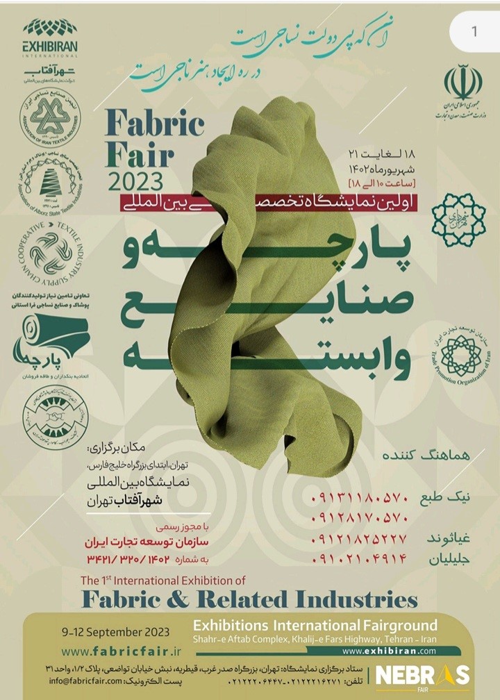 نمایشگاه تخصصی بین المللی پارچه و صنایع وابسته با شعار تعهد کیفیت و اصالت برند و با همکاری و مشارکت اتحادیهها و انجمنهای تخصصی و دست اندرکاران صنعت پارچه و نساجی کشور از تاریخ 18 لغایت 21 شهریور ماه ۱۴۰۲ (9 لغایت 12 سپتامبر 2023) در محل نمایشگاههای بین المللی شهر آفتاب تهران برگزار خواهد شد.