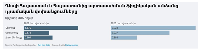 همچنین مبالغ قابل توجهی از ارمنستان به خارج از کشور منتقل میشود. در ژانویه تا ژوئن 2023، 2 میلیارد و 27 میلیون دلار آمریکا از ارمنستان به خارج از کشور منتقل شد که نسبت به ماههای مشابه سال قبل 2.3 برابر یا یک میلیارد و 151 میلیون دلار افزایش داشته است. پول ارسالی از ارمنستان به روسیه حدود 144 میلیون دلار و به آمریکا 90 میلیون دلار افزایش یافته است. به عبارت دیگر نمیتوان افزایش خروج حواله را به روسیه یا آمریکا نسبت داد. در مورد سایر کشورها، اطلاعات آماری هنوز منتشر نشده است.