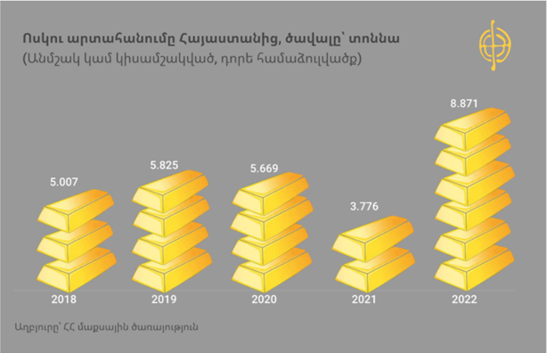 بر اساس اطلاعات گمرکی در سال 2022 حدود 8.9 تن (8871 کیلوگرم) طلای فرآوری نشده یا نیمه فرآوری شده از ارمنستان صادر شده که ارزش آن 414 میلیون دلار بوده است. میزان طلای صادراتی نسبت به سال قبل 2.3 برابر و ارزش آن 3.1 برابر افزایش یافته است. این به اصطلاح طلای خالص بانکی نیست. به صورت آلیاژ ناقص فرآوری شده، پودر یا شمش ناخالص صادر میشود که در آن علاوه بر طلا، نقره نیز وجود دارد.