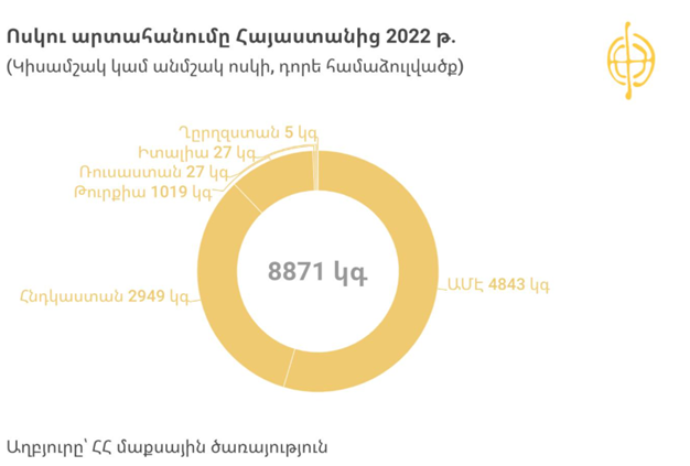 تجزیه و تحلیل دادههای رسمی نشان میدهد که تنها حدود 4.3 تن (4278566 گرم آلیاژ شمش) از 8.9 تن طلای صادراتی از ارمنستان در سال 2022، در ارمنستان تولید شده که طلای آلیاژی شمش است که به طور کامل توسط شرکت " GeoProMining Gold" به امارات متحده عربی و هند صادر شده است. در بین تولیدکنندگان و صادرکنندگان ارمنستان، هیچ شرکتی وجود ندارد که طلای این گروه کالایی را صادر کرده باشد.