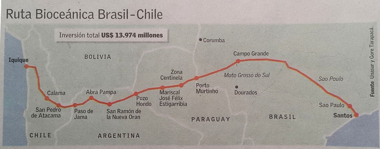 در نقشه طراحی شده؛ نقطه اتصال آزاد راه در شرق از بندر Santos در ساحل اقیانوس آتلانتیک آغاز و با عبور از کشورهای برزیل، پاراگوئه و آرژانتین به بندر اِکیکِه در شمال کشور شیلی و به ساحل اقیانوس آرام متصل خواهد شد. وجود منابع معدنی شیلی به ویژه معادن مس و لیتیوم در بیابانهای شمال این کشور بر اهمیت و مزایای نسبی پروژه برای طرف شیلیائی افزوده و سرمایه گذاری عظیمیبرای انجام امور زیربنائی و اجرای پروژه توسط دولت این کشور در دست اقدام است. در عین حال، شرکت های خصوصی فعال در بخش معدن در منطقه بیابانی شمال شیلی، علاوه بر مالکیت معادن، بعضا دارای بنادر خصوصی بمنظور صادرات منابع معدنی خود هستند.