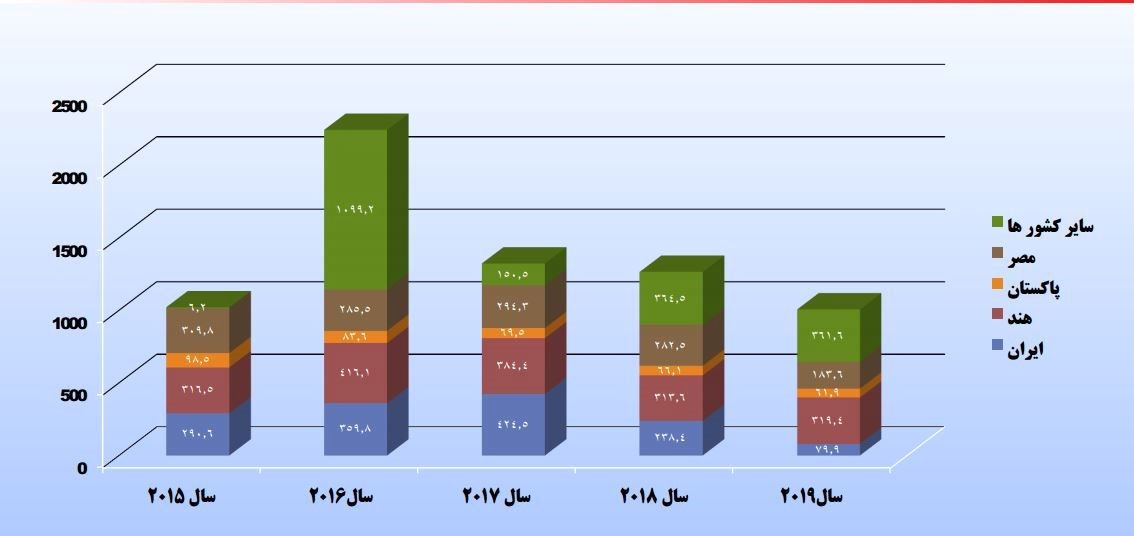 مقایسه صادرات فرش دستباف ایران و کشورهای رقیب طی سال های 2015 تا 2019 (واحد سنجش میلیون دلار)