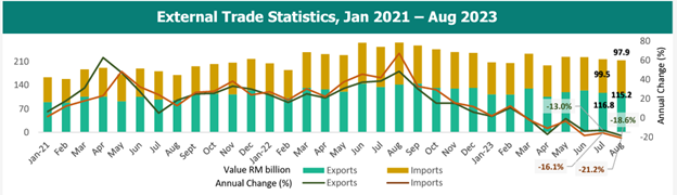 با اینحال حجم تجارت از مارس 2023 در مقایسههای ماه به ماه با مدت زمان سال گذشته نزول داشت و دیگر از رشدهای دو رقمی نشانی نبود. بر اساس آخرین دادههای رسمی منتشره از سازمان آمار مالزی، میزان صادرات مالزی در ماه آگوست به 115.2و میزان واردات به 97.9 میلیارد رینگیت میباشد.