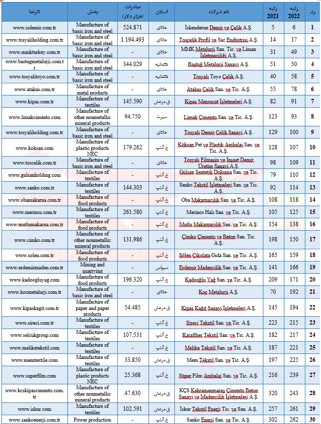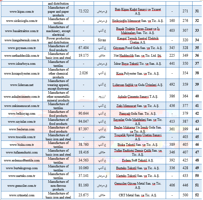 اتاق صنایع استانبول از سال 1968 تا به امروز همه ساله اقدام به شناسایی 500 شرکت برتر ترکیه نموده و اخیرا نیز اطلاعات مربوط به 500 شرکت برتر سال 2022 را منتشر کرده است. در این بین؛ اسامی 52 شرکت از منطقه شرق و جنوب شرق ترکیه نیز به چشم میخورد که در جدول ذیل جای داده شدهاند. (2023/09/26، اتاق صنایع و بازرگانی استانبول)