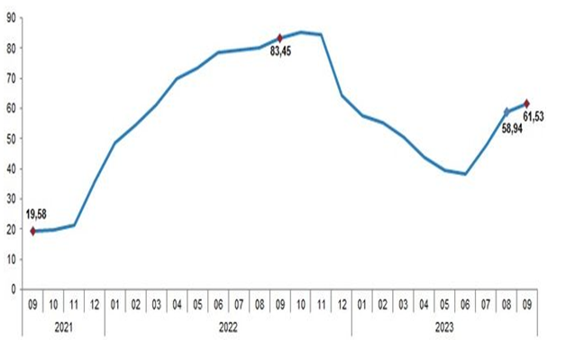 سازمان آمار ترکیه نرخ تورم این کشور برای ماه سپتامبر 2023 را اعلام کرد. بر این اساس، نرخ تورم در سپتامبر سالجاری با 4.75 درصد افزایش به 61.53 درصد رسید. به این ترتیب تورم سالانه برای سومین ماه به افزایش خود ادامه داد و به بالاترین سطح در سال 2023 رسید. در ماه قبل تورم سالانه 58.94 درصد و تورم ماهانه 9.09 درصد اعلام شده بود.