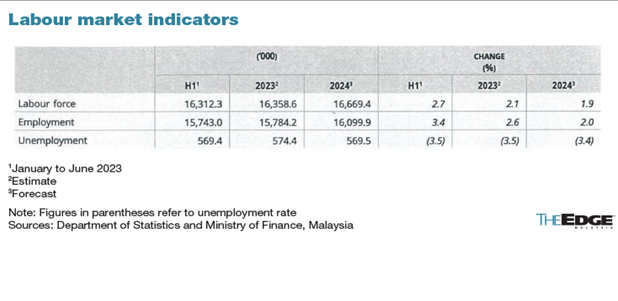 بر اساس گزارش چشم انداز اقتصاد مالزی تهیه شده توسط وزارت دارایی مالزی با پیش و بینی و انتظار واقع بینانه تداوم رشد اقتصادی این کشور در سال آتی و متعاقب آن افزایش سطح اشتغال، نرخ بیکاری تا انتهای سال آینده به 3.4 درصد و به سطح پیش از بحران کرونا خواهد رسید. میزان کل اشتغال با 2 درصد افزایش به 16.1 میلیون نفر و با توجه به جمعیت 16.7 میلیون نفری نیروی آماده به کار، نرخ بیکاری تا پایان سال 2024 به 3.4 درصد خواهد رسید. بخشهای تولید و خدمات همچنان با اختصاص بیش از 80 درصد نیروی کار دو بخش اصلی خواهند ماند. همچنین انتظار می رود بهره وری نیروی کار در سال آینده به 2.9 درصد افزایش و به 99900 رینگیت برسد. همچنین متوسط دستمزد و حقوق ماهانه انتظار می رود با 4.7٪ افزایش به ماهانه 3514 رینگیت (حدود 740دلار) افزایش یابد
