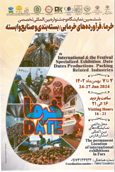 ششمین نمایشگاه بین المللی خرما و صنایع وابسته، قرار است طی روزهای 4 لغایت 7 بهمن ماه 1402 در محل دائمیبرگزاری نمایشگاههای بین المللی استان فارس (شیراز) برگزار گردد.