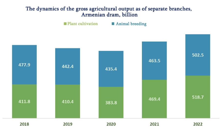 همانطور که گفته شد کشاورزی یکی از بخش های کلیدی اقتصاد کشور است که 4.10 درصد از تولید ناخالص داخلی (دادههای سال 2022) را تامین میکند. حدود 317000 واحد کشاورزی 2 .94 درصد از تولید ناخالص کشاورزی را تامین میکنند که به هر کدام به طور متوسط 48 .1 هکتار زمین اختصاص یافته است. 8 .21 درصد از شاغلان در جمهوری ارمنستان در بخش کشاورزی فعال هستند.