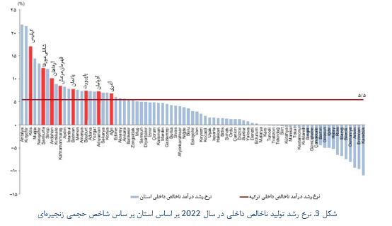 همچنین بر اساس دادههای منتشر شده رشد تولید ناخالص داخلی بر اساس شاخص حجمی زنجیرهای در 26 استان در سال 2022 نسبت به سال قبل از آن افزایش داشته است. بر همین اساس رشد تولید ناخالص داخلی ترکیه در سال 2022 نسبت به سال قبل برابر با 5/5 درصد بوده است. در بین 26 استان مذکور 8 استان کیلیس، شانلیعورفا، آرداهان، قهرمانمرعش، باتمان، بایبورت، آدیامان، آغری، رشدی بالاتر از میانگین ترکیه داشتهاند. همچنین سومین استان دارای بیشترین رشد تولید ناخالص داخلی بر اساس این شاخص مربوط به استان کیلیس با 17% بوده است. بعلاوه استان ارزنجان دومین استان دارای بیشترین کاهش تولید ناخالص داخلی بر اساس این شاخص با نسبت 11% کاهش بوده است.