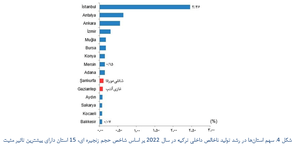 استانهای شانلیعورفا و غازیآنتپ نیز در میان استانهای دارای بیشترین تاثیر مثبت بر روی رشد تولید ناخالص داخلی ترکیه در سال 2022 قرار دارند.