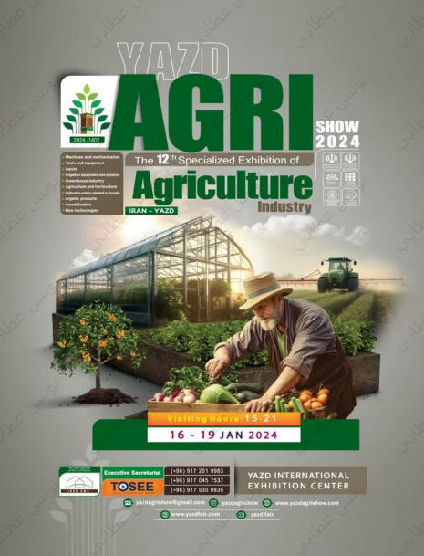 دوازدهمین نمایشگاه تخصصی صنعت کشاورزی یزد(YAZD AGRI SHOW) با محوریت ادوات و ماشین آلات، نهادهها، تجهیزات و سامانههای آبیاری، صنعت گلخانه، زراعت و باغبانی، هوشمندسازی و فناوری های نوین، الگوی کشت سازگار با کم آبی و محصولات ارگانیک از تاریخ 26 لغایت 29 دی ماه 1402 ( 16 تا 19 ژانویه2024) در محل دائمی نمایشگاههای بین المللی استان یزد و در فضایی به متراژ 5 هزار متر مربع برگزار می گردد.