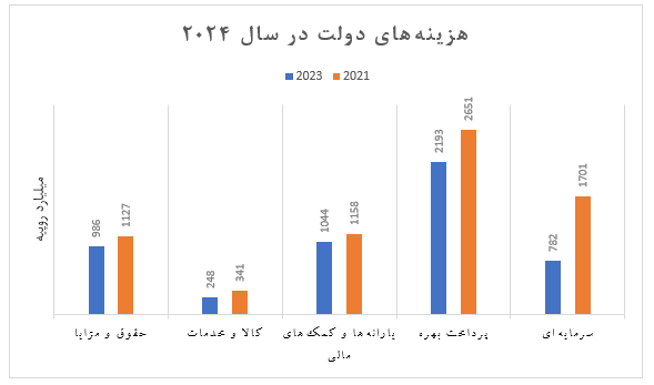 با وجود آنکه مخارج نسبت به سال قبل 33 درصد افزایش یافته است اما نسبت به تولید ناخالص داخلی تقریباً ثابت باقی ماند، زیرا در سال 2023، این میزان برابر با 18.4 درصد و در سال 2022، 18.5 درصد بود. البته یک تحول اساسی در این بین به افزایش قابل توجه و 118 درصدی سهم بودجه سرمایهای نسبت به سال 2023 است، اقدامیکه ناشی از یک بازنگری اساسی در بودجه سال 2023 و کاهش 36 درصدی سهم این بخش از بودجه بود.