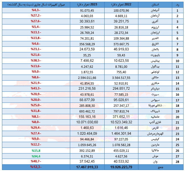 صادرات کل 28 استان شرق و جنوب شرق ترکیه در سال 2023 میلادی به ارزش 17،467،919،33هزار دلار بوده که نسبت به سال 2022 میلادی 12.3 درصد کاهش داشته است.