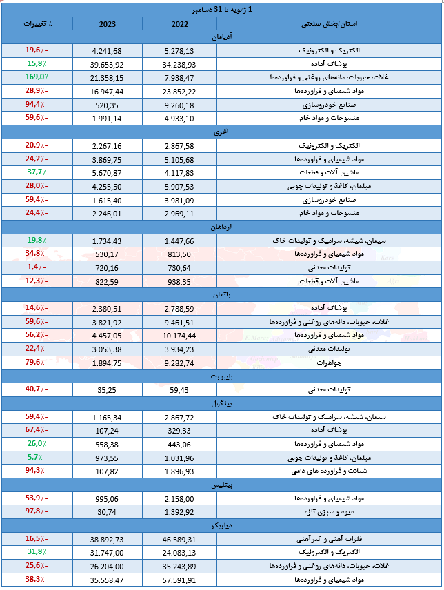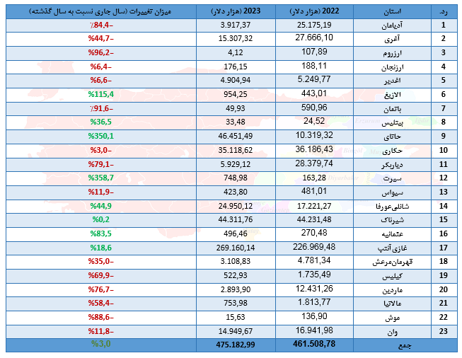 آمار صادرات استانهای شرق و جنوب شرق ترکیه به جمهوری اسلامی ایران در سال 2023