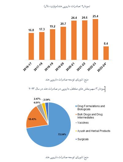 در سال مالی 2023، صادرات داروی هند به 25.39 میلیارد دلار آمریکا رسید. طی سالهای 2022-2021، صادرات محصولات دارویی این کشور به رقم 24.59 میلیارد دلار رسید، این در حالی است که در سالهای 2021-2020، صادرات با 18 درصد رشد سالانه به 24.44 میلیارد دلار رسیده بود. این کشور از آوریل تا ژوئیه 2023، 8.71 میلیارد دلار دارو و محصولات دارویی صادره کرد که 3.99 درصد نسبت به رقم 8.38 میلیارد دلاری در آوریل تا ژوئیه 2022 افزایش نشان داده است.