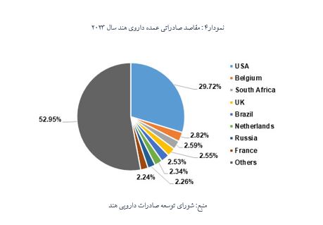 نزدیک به دو سوم صادرات دارویی هند به کشورهای نفتا، اروپا و آفریقا انجام میشود. ایالات متحده آمریکا، بلژیک، آفریقای جنوبی، بریتانیا و برزیل مقاصد صادراتی اصلی هند در سال مالی 2023 بوده اند. صادرات محصولات دارویی هند به این کشورها در سال مالی 2023 شامل: آمریکا با 7.54 میلیارد دلار، بلژیک با 714.92 میلیون دلار، آفریقای جنوبی با 657.0 میلیون دلار، انگلیس با 647.68 میلیون دلار و برزیل با 642.67 میلیون دلار بوده است. صادرات داروی هند به ایالات متحده از نظر ارزش با 6.18 درصد در سال گذشته افزایش یافته است. علاوه بر این، رقم صادرات به بلژیک و آفریقای جنوبی به ترتیب با 59.2٪ و 7.23٪ در مدت مشابه رشد کرده است.