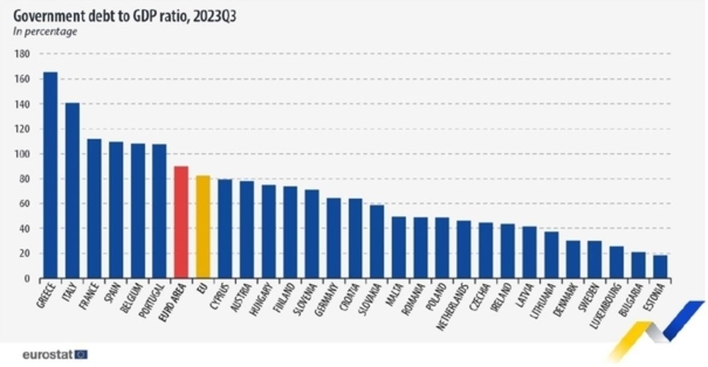 در پایان سه ماهه سوم سال گذشته، کمترین نسبت بدهی دولت به تولید ناخالص داخلی (GDP) در میان کشورهای اتحادیه اروپا در استونی (با 18.2 درصد)، بلغارستان (با 21 درصد)، لوکزامبورگ (با 25.7 درصد)، سوئد (با 29.7 درصد) و دانمارک (با 30.1 درصد) ثبت شده است. بالاترین نسبت بدهی عمومیبه تولید ناخالص داخلی در پایان سپتامبر 2023 نیز در یونان (با 165.5 درصد)، ایتالیا (با 140.6 درصد)، فرانسه (با 111.9 درصد)، اسپانیا (با 109.8 درصد) و بلژیک (با 108 درصد) به ثبت رسیده است. در مقایسه با سه ماهه سوم سال 2022، در پایان ژوئیه تا سپتامبر 2023، 8 کشور اتحادیه اروپا افزایش نسبت بدهی دولت به تولید ناخالص داخلی خود را گزارش کردند: بلژیک (+2.5 واحد درصد)، استونی (+2.3 درصد)، فنلاند (+2 واحد درصد)، لتونی (+1.3 درصد)، اسلواکی، رومانی و لوکزامبورگ (هر کدام + 1 درصد) و لیتوانی (+0.4 درصد). بیشترین کاهش در نسبت بدهی عمومیبه تولید ناخالص داخلی در میان کشورهای اتحادیه اروپا نیز در این دوره در قبرس (-5.6 واحد درصد)، پرتغال (-2.5 درصد)، کرواسی (-2.2 درصد)، ایتالیا (-1.8 درصد)، یونان (-1.6 درصد) و اسپانیا (-1.4 درصد) ثبت شده است.