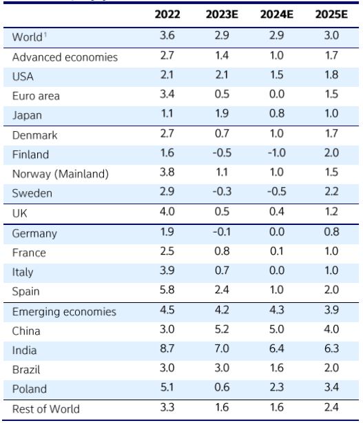 هلگه پدرسن، اقتصاددان ارشد این گروه میگوید: این وضعیت، احتمال فرود نرم را افزایش میدهد، اما عدم اطمینان در اقتصاد همچنان زیاد است. در ادامه این گزارش آمده اقتصادهای شمال اروپا اثرات نرخ بهره بالاتر و تقاضای جهانی ضعیفتر را احساس میکنند. دانمارک و سوئد در حال حاضر در رکود تکنیکال هستند. فنلاند نیز احتمالا از این روند پیروی خواهد کرد و فعالیت اقتصادی در نروژ هم کاهش یافته است. البته با کاهش نرخ بهره و تقویت قدرت خرید مصرف کننده، چشمانداز باید در نیمه دوم سال روشن شود. جدول زیر برآورد رشد اقتصادی سالانۀ کشورها و مناطق مختلف را از دیدگاه نوردیا نشان میدهد.