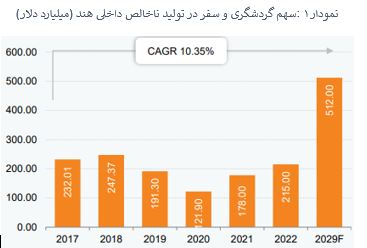 در حال حاضر حجم سفر از طریق خطوط هوایی هند حدود 20 میلیارد دلار تخمین زده میشود و پیش بینی میشود به دلیل بهبود زیرساخت های فرودگاهی و دسترسی رو به رشد به پاسپورت، تا سال مالی 2027 این رقم دو برابر شود. رقم درآمد هتل های هند در سال مالی 2020 حدود 32 میلیارد دلار برآورد شده است و انتظار می رود تا سال مالی 2027 به حدود 52 میلیارد دلار برسد، که ناشی از افزایش تقاضا از سوی مسافران و تلاش های مداوم آژانس های مسافرتی برای تقویت بازار است.