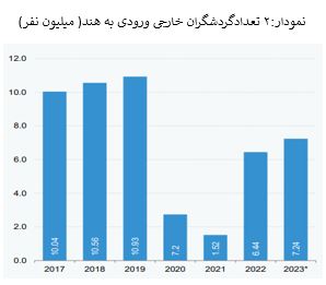 تعداد گردشگران خارجی که به هند سفر نموده اند در سال 2022، 6.44 میلیون نفر بوده اند که این رقم برای سال 2023 بالغ بر 7.24 میلیون نفر تخمین زده میشود.