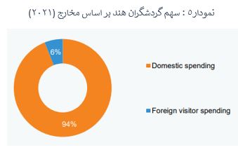 در سال 2021 گردشگران داخلی هند سهم 94 درصدی و گردشگران خارجی سهم 6 درصدی در مخارج گردشگری هند داشته اند. که پیش بینی میشود سهم گردشگران داخلی تا سال 2028 به 88 درصد کاهش و سهم گردشگران خارجی به 12 درصد افزایش یابد.