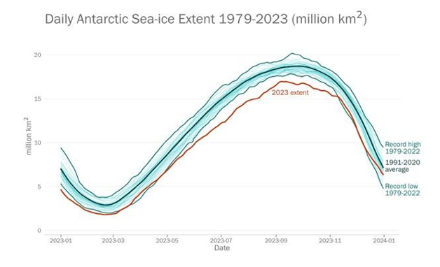 وسعت روزانه یخ دریا در قطب جنوب از ژانویه تا دسامبر. این نمودار شرایط 2023 (قرمز) را با آب و هوای عادی 1991-2020 (آبی تیره) مقایسه می‌کند و رکورد حداکثر و حداقل گستره را برای هر روز (آبی متوسط) ارائه می دهد. منحنی‌های آبی روشن مربوط به هر سال جداگانه است. منبع: مرکز داده ملی برف و یخ ایالات متحده.