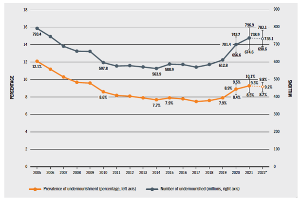 شیوع جهانی سوءتغذیه (در درصد) و تعداد افراد کم‌تغذیه (به میلیون‌ها نفر) از سال 2005. کل مجموعه منعکس‌کننده اطلاعات جدید منتشر شده از زمان انتشار «وضعیت امنیت غذایی و تغذیه در جهان 2023» به‌روزرسانی شده است.