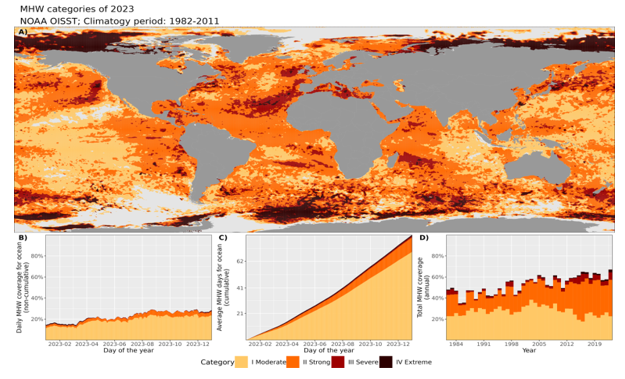 الف)رنگ خاکستری روشن مربوط به پیکسل هایی است که در آن هیچ موج گرمای دریایی در طول سال مشاهده نشده است. ب) نمودار میله ای انباشته نشان دهنده درصدی از سطح اقیانوس که تحت تأثیر موج گرمای دریایی در هر روز از سال قرار گرفته است. ج) نمودار میله‌ای پشته‌ای که تعداد تجمعی روزهای همراه با موج گرمای اقیانوس را نشان می‌دهد که میانگین آن بر روی سطح اقیانوس است. د) نمودار میله‌ای انباشته‌ای که درصد کل سطح اقیانوس را نشان می‌دهد که از سال 1982 موج گرمای دریایی را تجربه کرده است. داده‌ها از مجموعه داده‌های اتمسفر (NOAA) سازمان ملی اقیانوسی برای درون یابی بهینه دمای سطح دریا (OISST) آمده است. بر اساس تجزیه و تحلیل داده‌های تلفیقی، در سال 2023، میزان گرمای اقیانوس ها به بالاترین حد خود رسید. سرعت گرم شدن آب ها در دو دهه گذشته به میزان قابل توجهی افزایش یافته است. طبق همه انتظارات، این گرمایش ادامه خواهد داشت و باعث تغییرات غیرقابل برگشت برای قرن‌ها، حتی هزاره‌ها می‌شود. افزایش فرکانس و شدت امواج گرمای دریایی اثرات منفی عمیقی بر اکوسیستم های دریایی و صخره‌های مرجانی دارد.
