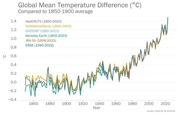 تا سال 2023، میانگین دمای جهانی نزدیک به سطح، تقریباً 1.45 درجه سانتیگراد (0.12 ± درجه سانتیگراد) از میانگین دمای پیش از صنعت 1900-1850 فراتر رفته است. سال 2023 گرم ترین سال در 174 سال رصد بود که رکوردهای گرمایی سالانه قبلی را شکست، یعنی: 2016 (1.29 ± 0.12 درجه سانتی گراد بالاتر از میانگین (1900-1850) و 2020 (1.27 ± 0.13 درجه سانتی گراد).